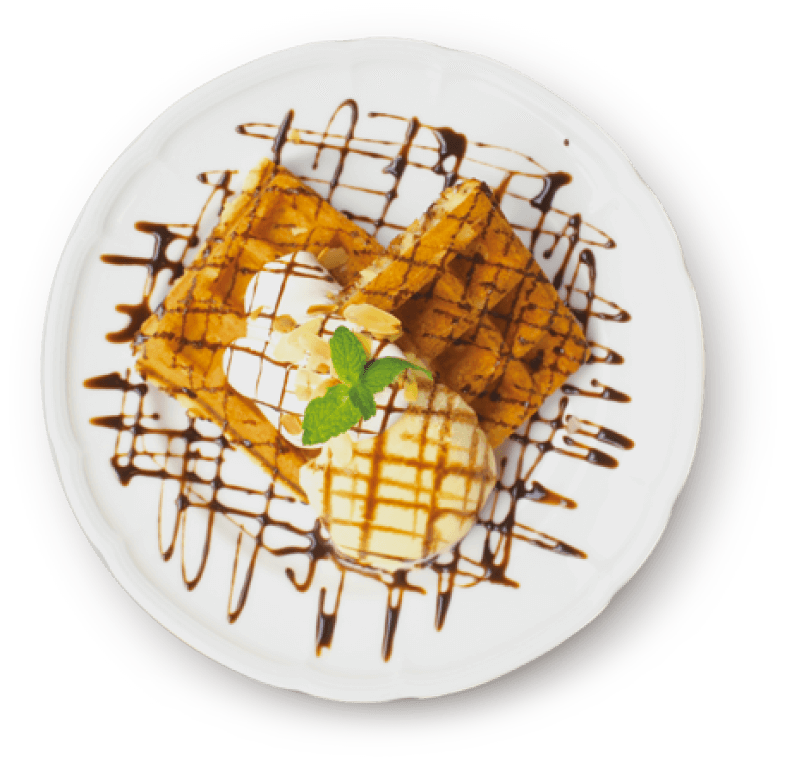お客様からご注文をいただいてから、一枚一枚丁寧に焼き上げるので、外はサクサク!中はふんわりとした抜群の食感でお召し上がりいただけます。焼きたてのワッフルには、バターや生クリームはもちろん、冷たいアイスクリームとの相性も抜群で、美味しさをさらに引き立てます。